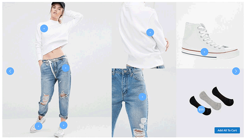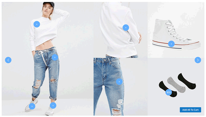 This button help customers save time for buying all products. If they consider these items, instead of clicking “buy now” several times, one click “Add all” will put all simple products (without options) in the current Lookbook or slider piece into the shopping cart.